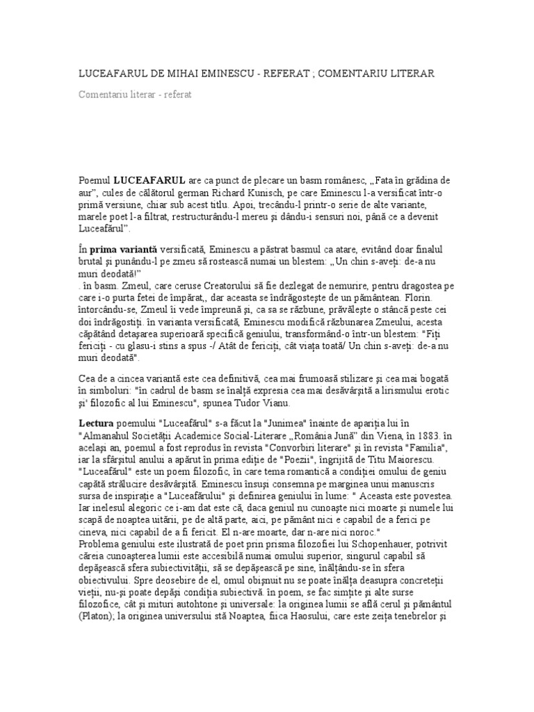 Si totusi poemul luceafarul este o creatie lirica. Din mărturia sa reiese că pornind de la o sursă. Di rude ari î părăteşti. E înmormântat la bucurești, în cimitirul bellu; Comentariul poeziei luceafărul de mihai eminescu este unul dintre cele mai complexe materiale pe care le poți folosi pentru o pregătire eficientă atât pentru ora de limba română, cât și pentru examenul.
